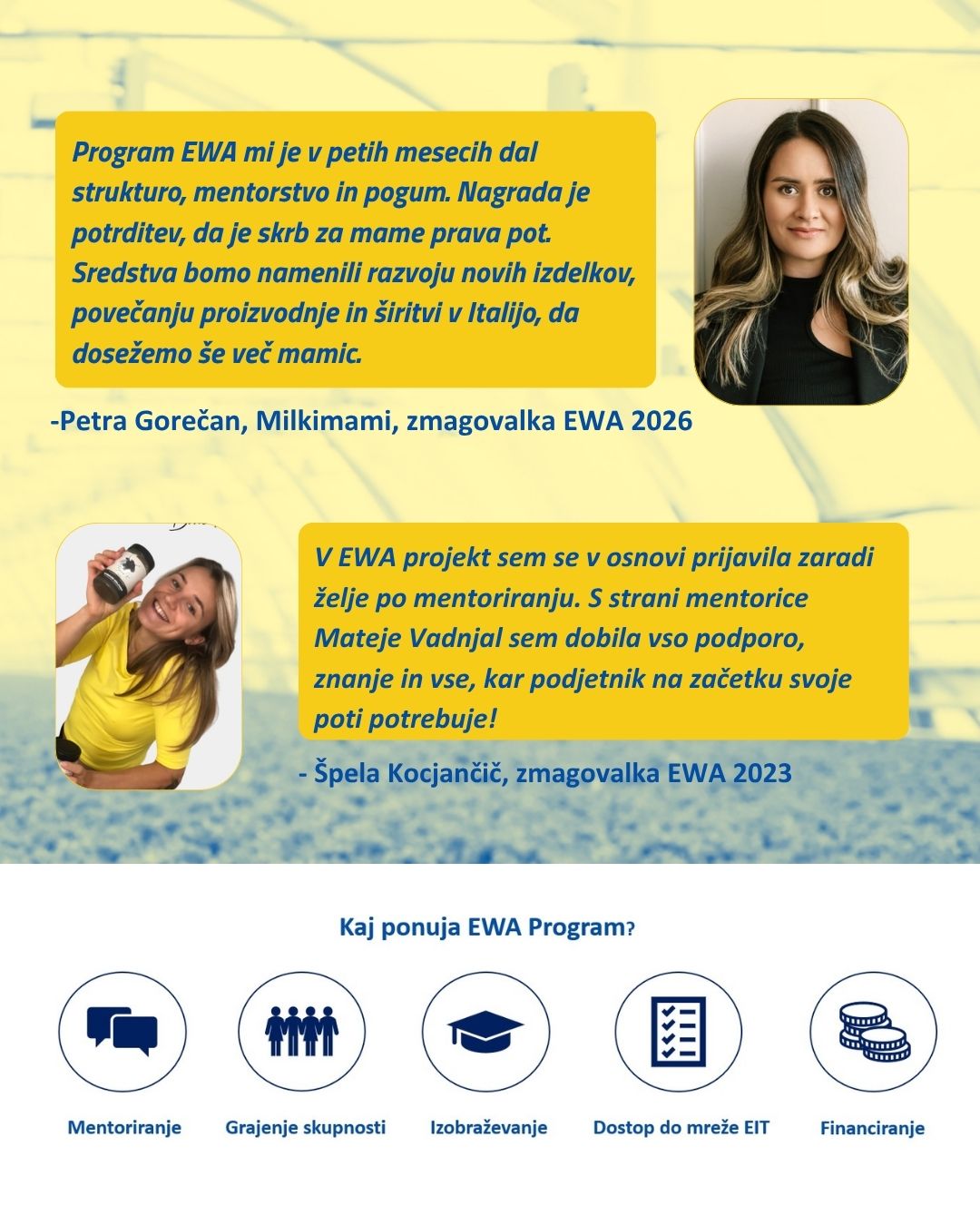 EIT Food v sodelovanju s Centrom poslovne odličnosti Ekonomske fakultete Univerze v Ljubljani že tretjič v Sloveniji izvaja program EWA – Empowering Women in Agrifood. Namen programa je opolnomočiti ženske v agroživilskem sektorju, zmanjševati vrzel med spoloma ter podpreti razvoj inovativnih podjetniških idej.